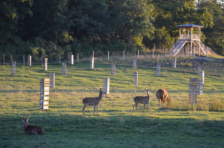 Das Symbol „Rind“ führt um die Hutungsfläche von fränkischem Gelbvieh und Rothirschen und bietet unterschiedliche Blickwinkel auf die Tiere. Halb durch Wald und halb durch Offenland ist der Weg für alle Altersklassen und auch für Kinderwägen geeignet.
