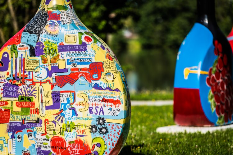 10 Studierende der Hochschule Würzburg/Schweinfurt – Studiengang „Kommunikationsdesign“ und ein Student der Architektur, Universität Leipzig fanden sich an einem langen Wochenende im Lehr- und Versuchskeller der Bayerischen Landesanstalt für Weinbau und Gartenbau in Veitshöchheim ein, um 10 übergroße Formen des vom renommierten Hamburger Designer neu gestalteten Bocksbeutel PS mit künstlerischen Motiven zum und über den Wein zu versehen. Diese reichen von der Ökologie über das Terroir, den Herstellungsprozess bis zur großen weiten Welt des Weines. Es gab dazu keine Vorgaben und die jungen Studierenden waren mit großer Begeisterung und natürlich viel Frankenwein dabei.