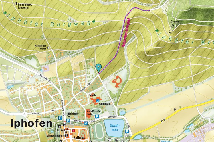 Der Iphöfer Rebsorten-Lehrpfad führt ab dem Rödelseer Tor entlang des Schwanbergweges durch die Weinlage „Iphöfer Kronsberg“ hinauf zum Geschichtsweinberg an der Schwanbergswiese.